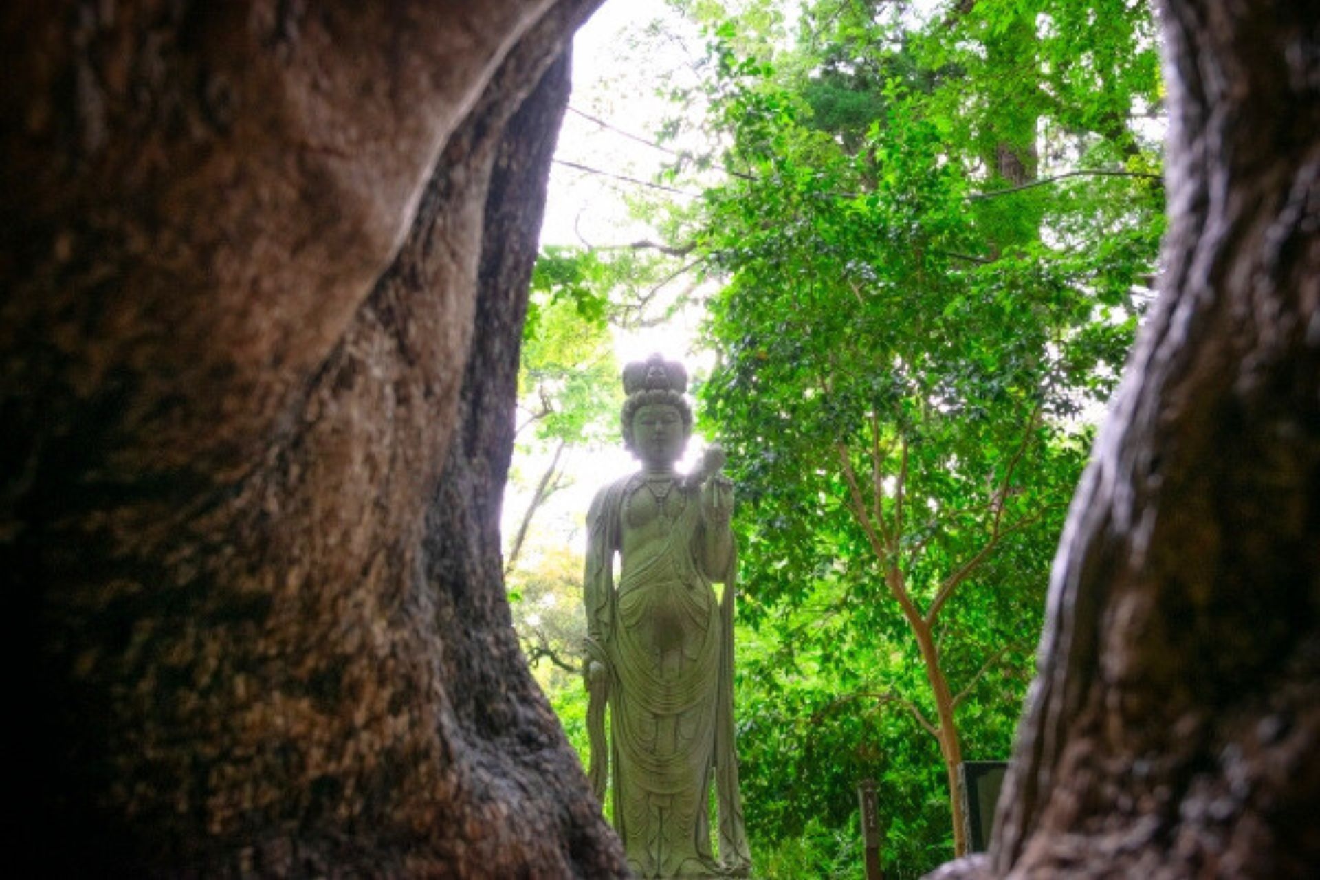 楠の根元のトンネルをくぐった先に安置されている「子授観音」に子授け祈願をするご夫婦も多くいらっしゃるとか。